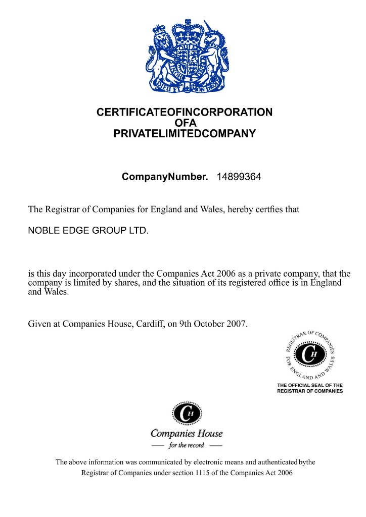 Noble Edge Group Ltd is a duly registered and incorporated private limited company under the Companies Act 2006. Our official registration with Companies House demonstrates our commitment to transparency, regulatory compliance, and operating with the highest standards of corporate governance.